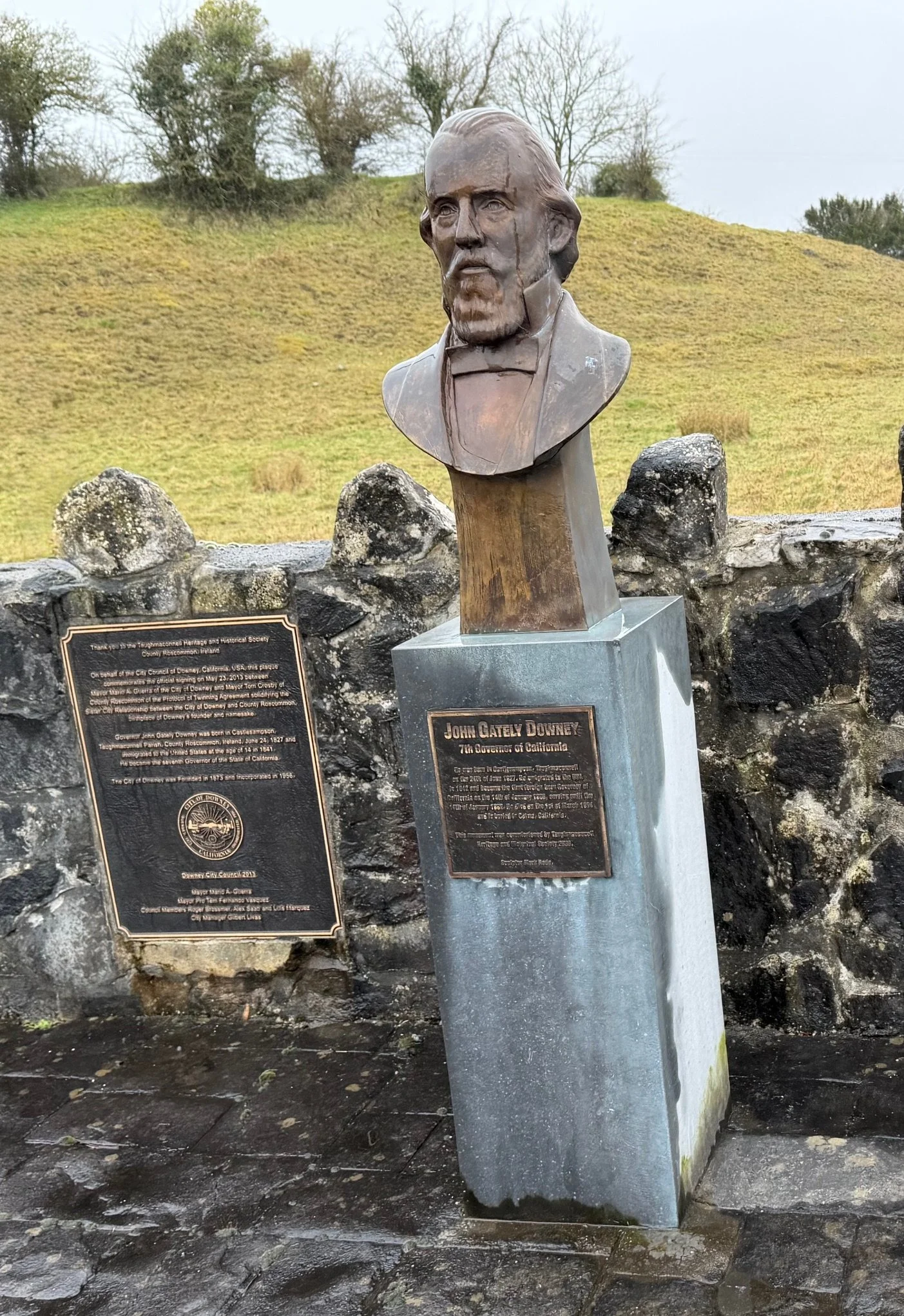 There is also a unique symbol of our shared heritage that also stands in both communities: a bust of John Gately Downey. The original, created by a Roscommon artist, sits along a roadway in Ireland. Inspired by that piece, I commissioned the same artist to create a second bust, which now stands in front of Downey City Hall. Only two exist in the world—one where his life began, and one where his legacy flourished.