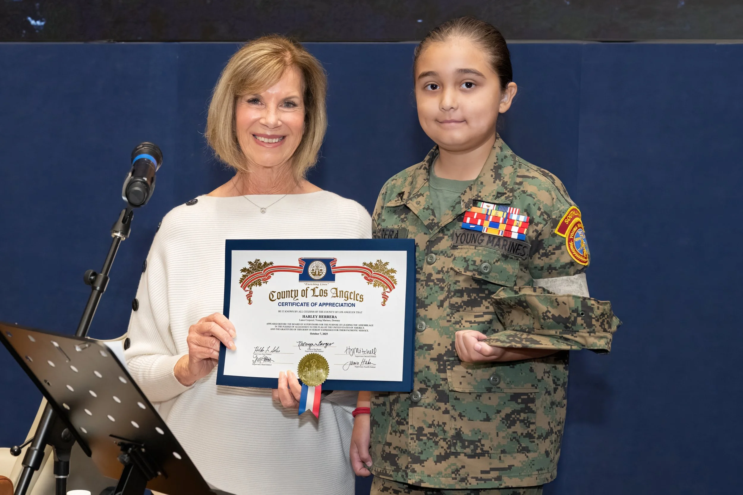 Herrera is a Lance Corporal with the Southland Young Marines program. She caught Supervisor Hahn’s attention after writing to her office asking for a motion to promote Red Ribbon Week in Los Angeles County to educate youth about the dangers of drugs.