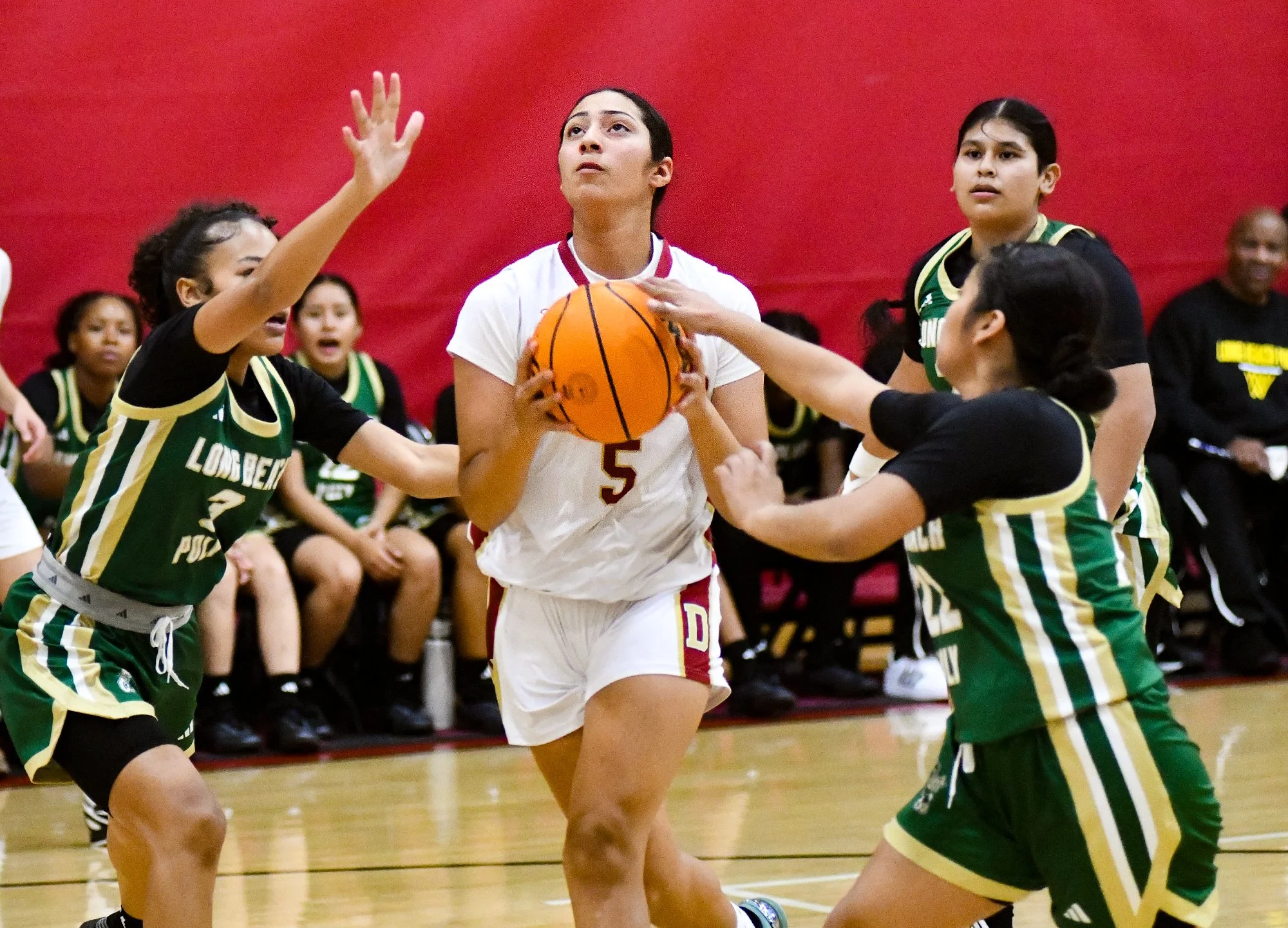 Downey’s Natalie Gomez (5) drives past Long Beach Poly defenders to score in the 48th Annual Downey Classic girls basketball tournament at Downey High School on Wednesday. Downey defeated Long Beach Poly 51-42. (Photo by Keith Durflinger)