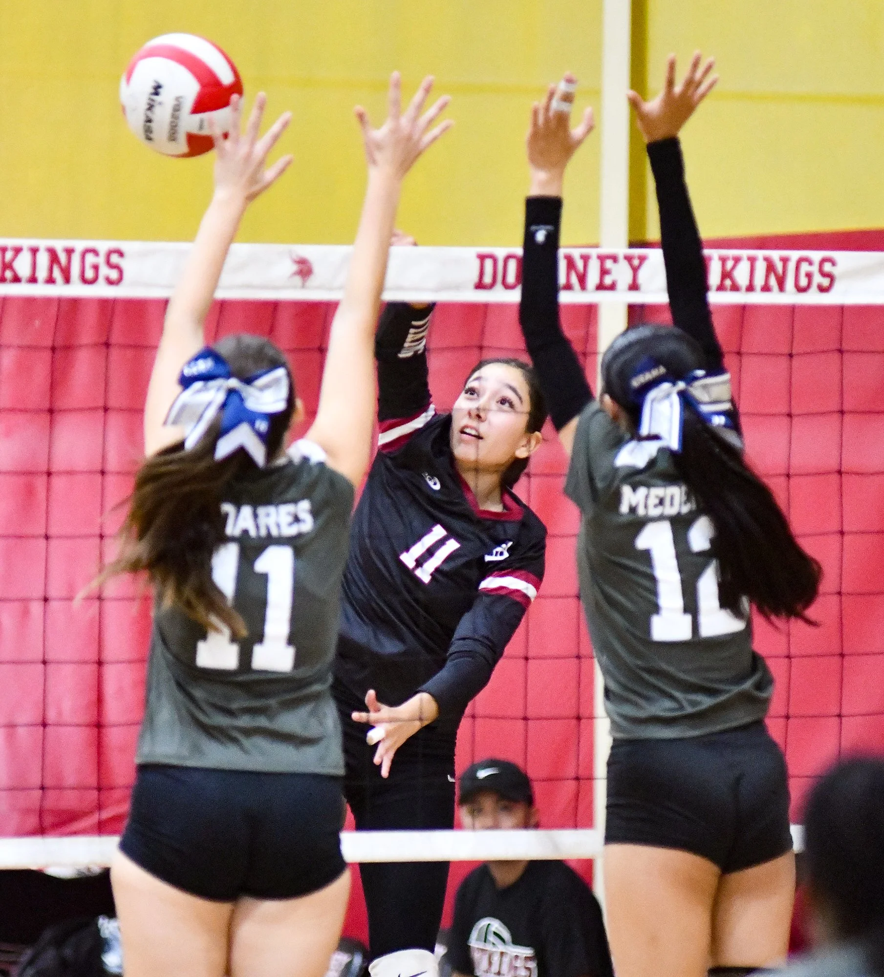 Downey’s Jannin Vilchis (11) hits the ball into Mayfair defenders in their Gateway League girls volleyball game at Downey High School on Tuesday. Downey defeated Mayfair 3-0. (Photo by Keith Durflinger)