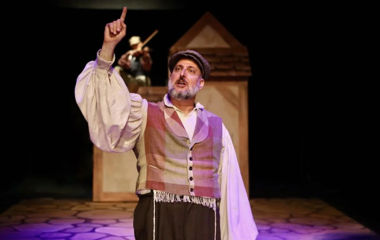 This is a full Broadway musical staged in an intimate space with a full cast of 25 along with musicians occasionally onstage. Director Gregory Cohen maximizes the intimacy of the space and performances. He makes some creative choices including presetting the actors onstage, engaging with each other as the audience enters. (The Constable -- in a strong and firm manner -- told me I did not have permission to enter the village as I was weaving to my seat through the full house.)