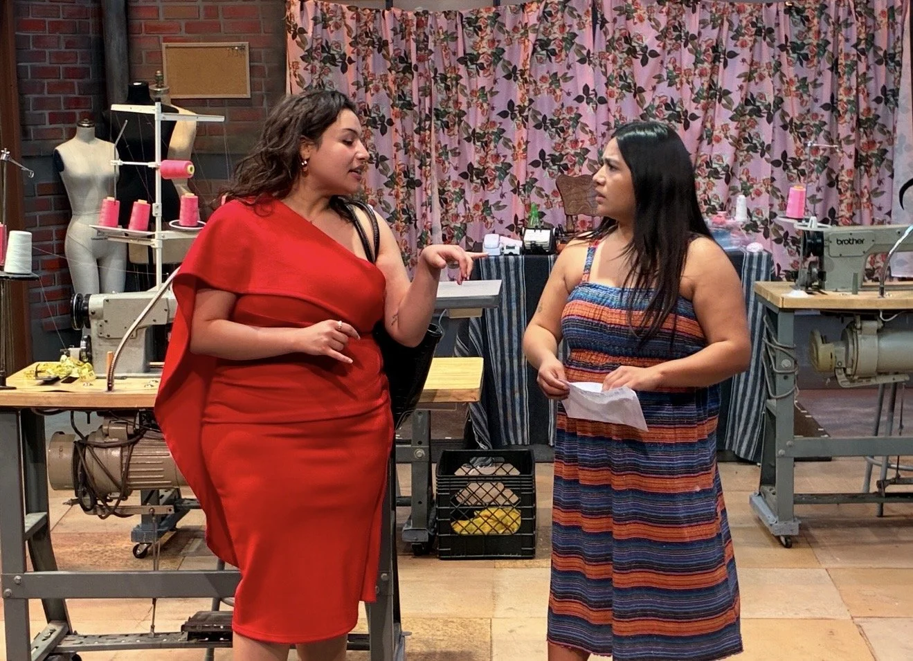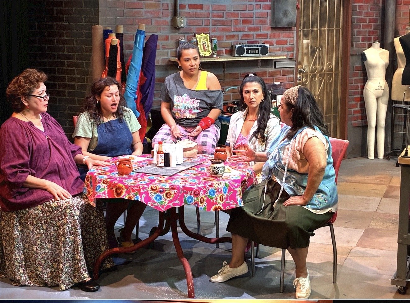 Dominguez moves them naturally and purposefully through an exceptional set designed by César Retana-Halquín. The tiny, colorful dress factory is filled with working sewing machines, mannequins, fabric, a kitchen area, a lunch table, ironing boards and dress racks. A raised bathroom is where Ana secretly writes in her journal the stories she hears.