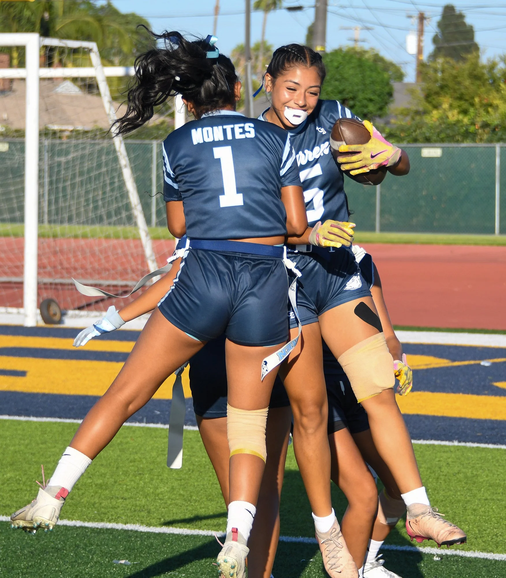 In Monday’s win over El Modena, sophomore quarterback Madeline Garcia ran for 77 yards on 12 carries for a 6.4 average. She also threw for 261 yards to seven different receivers. Senior receivers Chloe Cotton and Adriana Maldonado caught two touchdown receptions each.