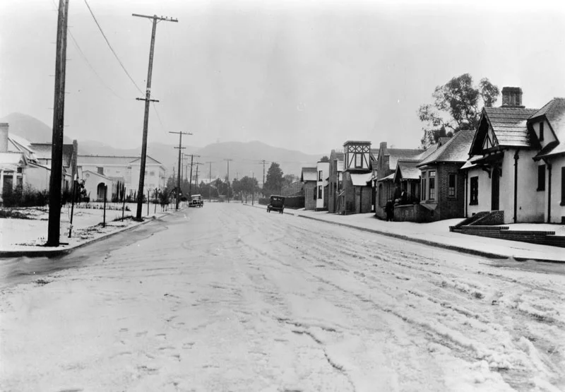 Snow on La Brea Boulevard in Hollywood in 1921. L.A. Public Library photo